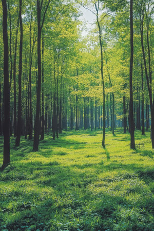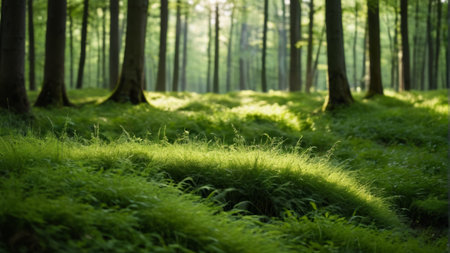 Sunlight filters through the tall trees of a vibrant green forest casting gentle shadows on the lush grass below. This peaceful setting invites exploration and tranquility.