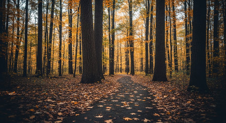 A forest path is presented, framed by tall trees in autumnal colors. Golden leaves blanket the ground, leading the eye toward the horizon. The composition utilizes natural lighting and a central perspective. This image could be used in various commercial or editorial contexts, evoking a sense of tranquility.