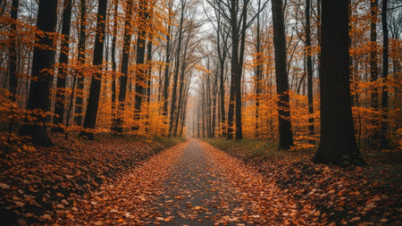A pathway extends through a forest of tall trees during autumn. The scene is dominated by warm orange and brown colors, with fallen leaves covering the ground. The composition features a symmetrical arrangement, and the lighting suggests a daytime setting. This image could be used for various commercial or editorial purposes.