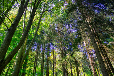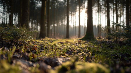 Fir tree woods in early morning with beautiful sunlight