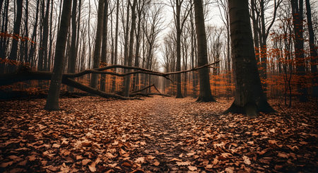 A serene forest landscape during the autumn season features a path covered in brown fallen leaves. Tall trees with bare branches stretch upwards in the quiet woods, evoking a sense of seasonal change and tranquility.