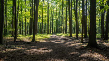 A forest scene showcases tall trees and a pathway winding through lush vegetation. The image displays a natural environment with vibrant green foliage and sunlight filtering through the canopy. This photograph could be used for various purposes, including editorial content, nature documentaries, or environmental illustrations.