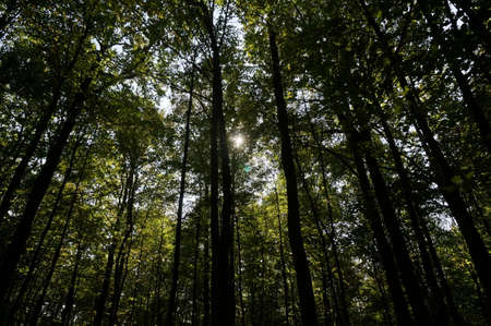 Low angle shot of magical scenic forest, with the sun casting its warm light through the foliage. Natural background. Reinhardswald - germany