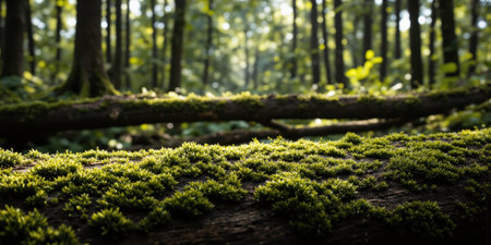 Primordial Forest Carbon Ancient moss patterns on fallen logs creating abstract textural study in trending regenerative greens without identifiable woodland