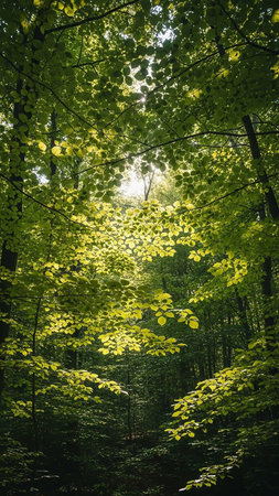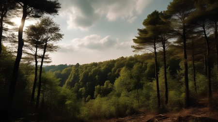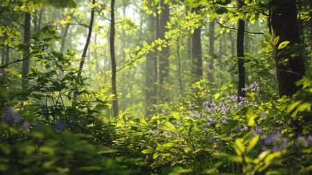 Tranquil scene of a vibrant forest with a mysterious wilderness generated by artificial intelligence