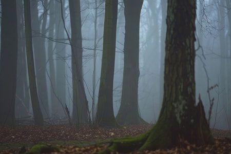 Morning in the forest with fog and trees, Bialowieza Forest, Poland