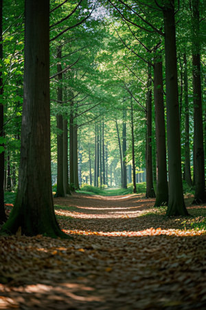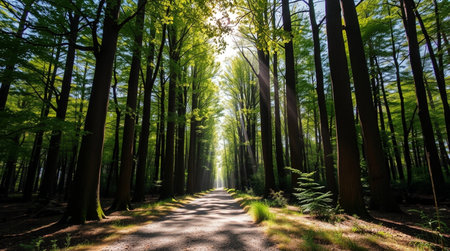 A path winds through a verdant forest, surrounded by tall trees and vibrant foliage. Sunlight filters through the canopy, creating a play of light and shadow. The composition focuses on the natural environment, likely suitable for illustrating themes of nature, travel, or environmental conservation, and various commercial purposes.