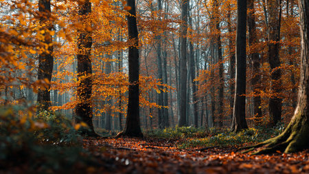 Beautiful autumn forest in the morning. Fall in the woods.