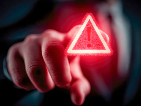 A figure gestures toward a vivid red caution icon with an exclamation mark, set against a dark, indistinct backdrop, emphasizing urgency and attention.