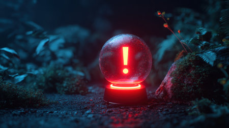 Red warning sign glowing in glass orb on dark forest floor surrounded by lush greenery, illuminating a mysterious scene at night in nature