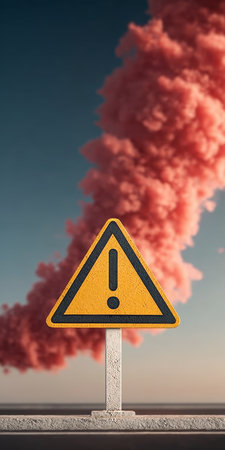 Exclamation Mark Road Sign Warns of Towering Pink Clouds, Indicating Potential Danger Ahead