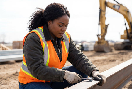 A focused black woman construction worker wearing a safety vest and gloves is diligently tightening a bolt on a metal beam with a wrench at an outdoor construction site, demonstrating hard work and dedication in the industry.