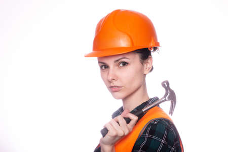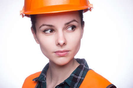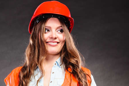 Woman construction worker builder structural engineerin in orange vest red hard helmet. Safety in industrial work. Studio shot