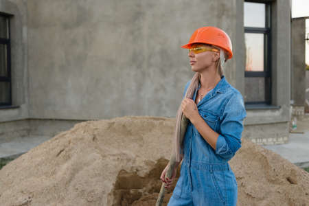 Portrait of a female construction worker on the background of a new building