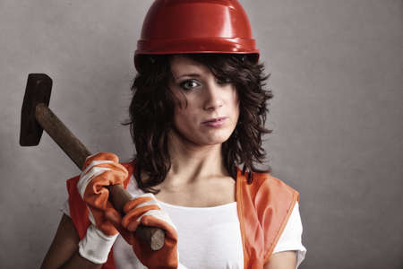 Sex equality and feminism. Sexy girl in safety helmet orange vest holding hammer tool. Attractive woman working as construction worker.