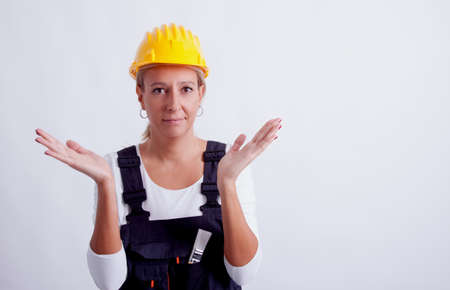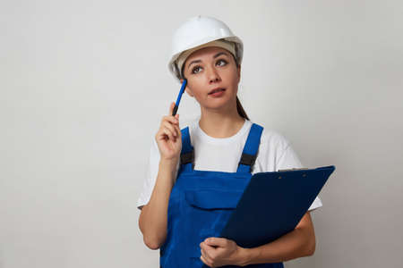Portrait of young woman worker standing on white background with copy space. Female worker wearing workwear uniform and protective hard hat