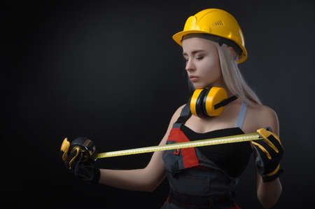 girl in a construction firm works with a tape measure