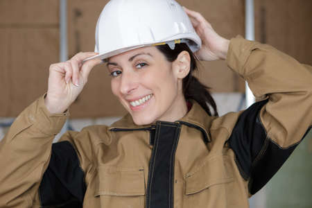Portrait of pretty woman structural engineer wearing helmet. Girl working in man profession. Independent female.