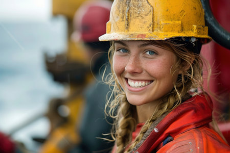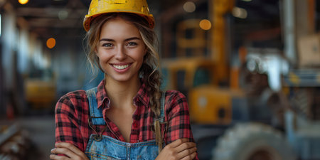 A construction site worker, confidently smiling under the hard hat, advocates for gender equality, showing the competence and determination of women in the construction sector