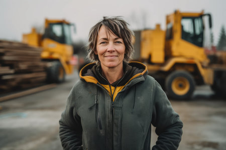 Portrait of a middle-aged woman in a yellow jacket standing on a construction site.