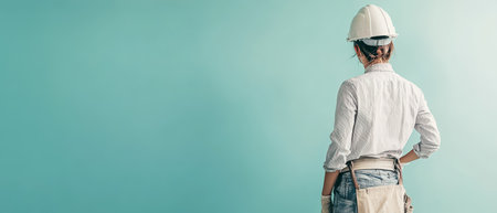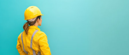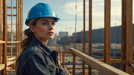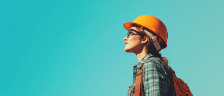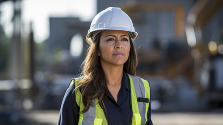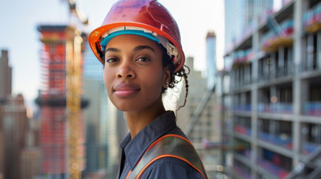 A confident female construction worker stands outdoors in a hard hat and safety vest. She gazes toward the horizon, embodying determination and professionalism in her field.