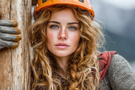 Female construction worker is posing beside a wooden beam outdoors, showing her determination and strength in a rugged environment.