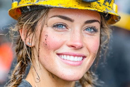 Woman wearing hard hat, smiling confidently with dirt on her face, reflecting hard work and determination in a rugged setting.