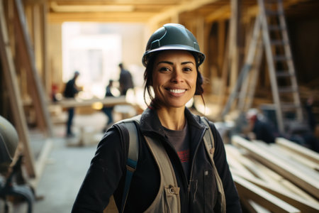 A smiling Hispanic female construction worker standing in construction site. Generative AI AIG19.