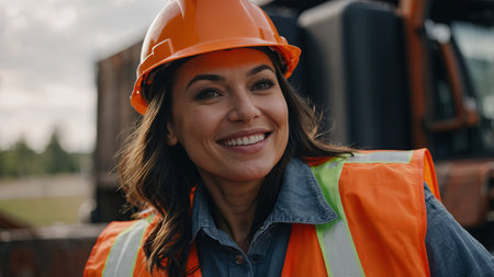 AI Generated. A woman wearing a bright orange safety vest and a hard hat is smiling