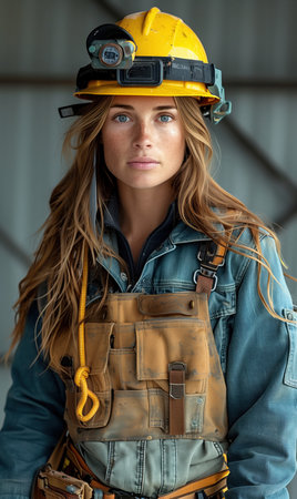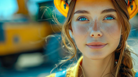 Determined female construction worker with blue eyes