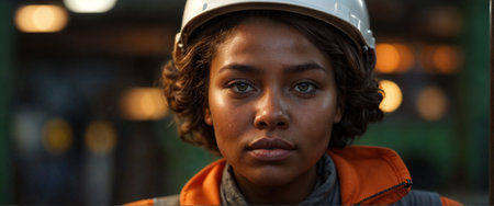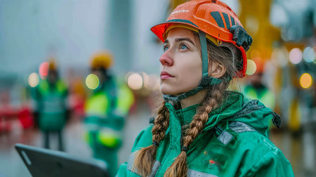 A determined female engineer safety gear gazes thoughtfully into distance, showcasing her focus