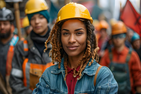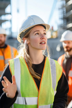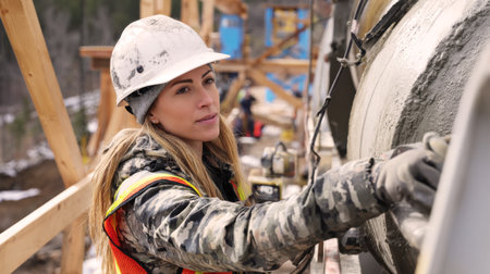 Young female cement worker leads her team at a lively construction site during daylight hours
