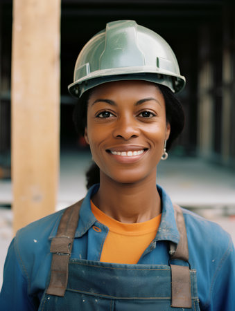 Portrait of a smiling african american woman construction worker standing outdoors