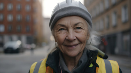 A smiling senior Swedish female construction worker standing in construction site. Generative AI AIG19.