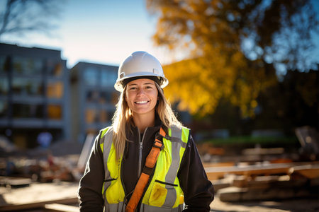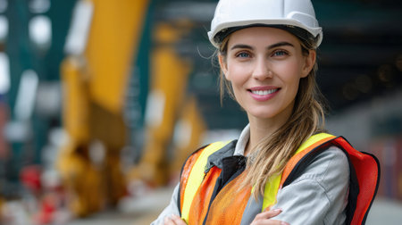 A confident female construction worker stands proudly at a construction site, wearing a hardhat and safety vest, symbolizing leadership and professionalism in the industry.