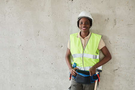 Waist up portrait of young African-American woman working at construction site and looking at camera, copy space