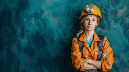 Composed young female miner with a reflective orange helmet, standing against a textured blue wall