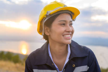 a woman engineer is putting a protective helmet on her head at sunset.