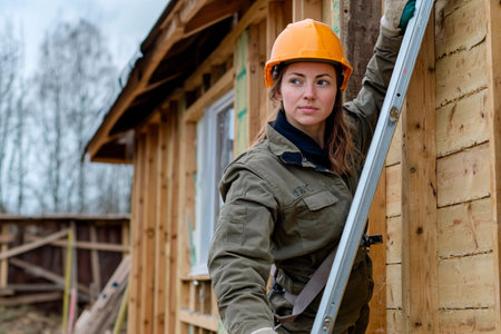 A determined woman is busy at a construction site, carefully positioning a ladder against newly constructed wooden walls.