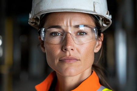 Confident female construction worker in hard hat and glasses
