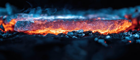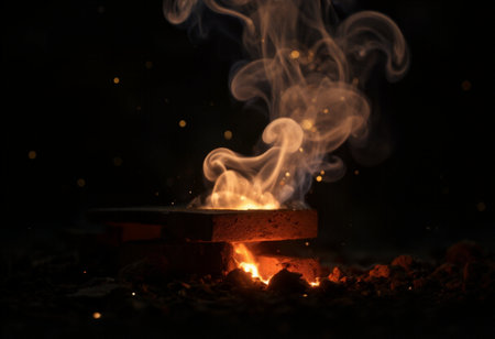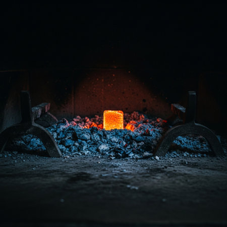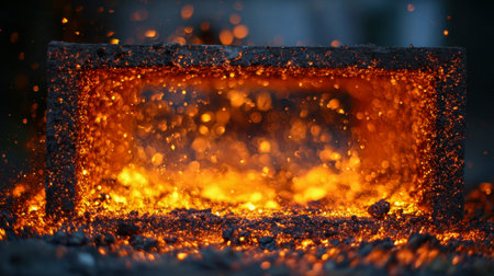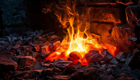 A captivating image showcasing bright flames and flying sparks from a charcoal bed in an artisan forge, illustrating the intense heat and craftsmanship of blacksmithing.