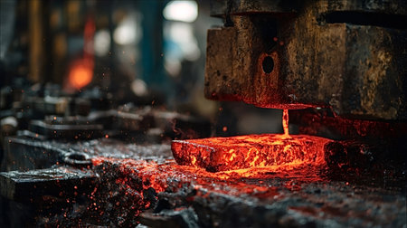 Red hot steel glowing under a forging press in an industrial foundry, sparks flying as molten metal is shaped on the production line amid heat, machinery and workers