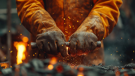 A seasoned artisan wearing sturdy gloves expertly molds fiery metal on an anvil, sending showering sparks as he passionately crafts a timeless masterpiece.