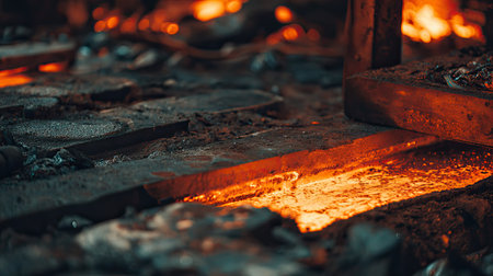 A vivid image capturing molten metal glowing intensely in a forge, surrounded by sparks and flames, showcasing the heat and artistry of metalworking.