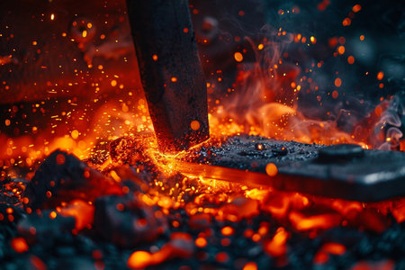 A close-up view of a hammer striking hot metal on an anvil, surrounded by glowing coals and fire in a blacksmith workshop. The image captures the artistry and craftsmanship involved in traditional metalwork and forging techniques.