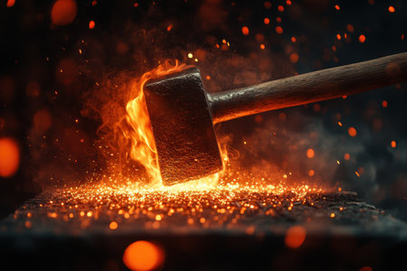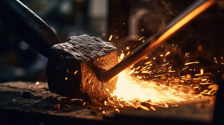 Powerful hammer strikes glowing hot metal on a rough anvil, creating a shower of bright sparks, representing intense creation and traditional craftsmanship, perfect for industrial or motivational themes.