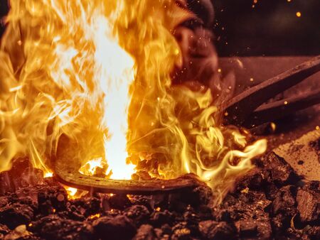 Fire crackling in blacksmith workshop of forging metal. Anonymouse craft smith create objects from wrought iron or steel with helper.
