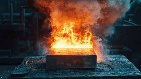 Smoke and fire erupt as glowing ingot is clamped and pressed with immense force