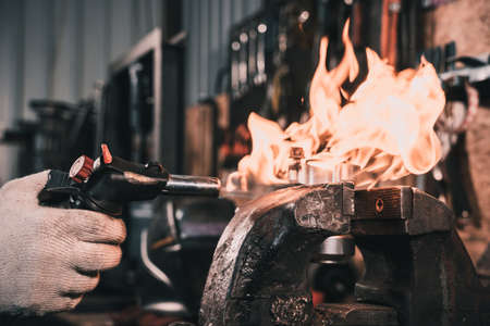 The blacksmith forging the molten metal on the rusty vise in smithy.
