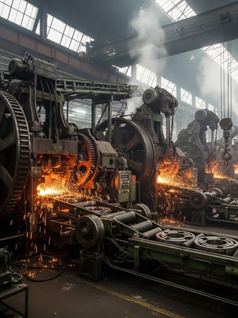 A dimly lit industrial factory interior with large, old-fashioned forging machines emitting bright sparks and smoke, highlighting the intense heat of metalworking.